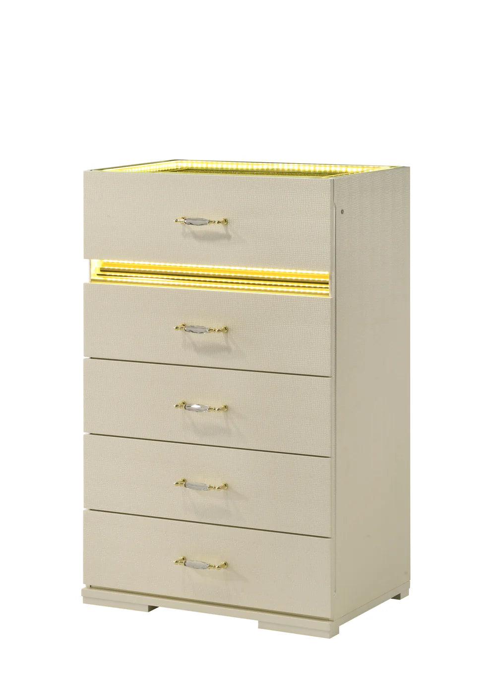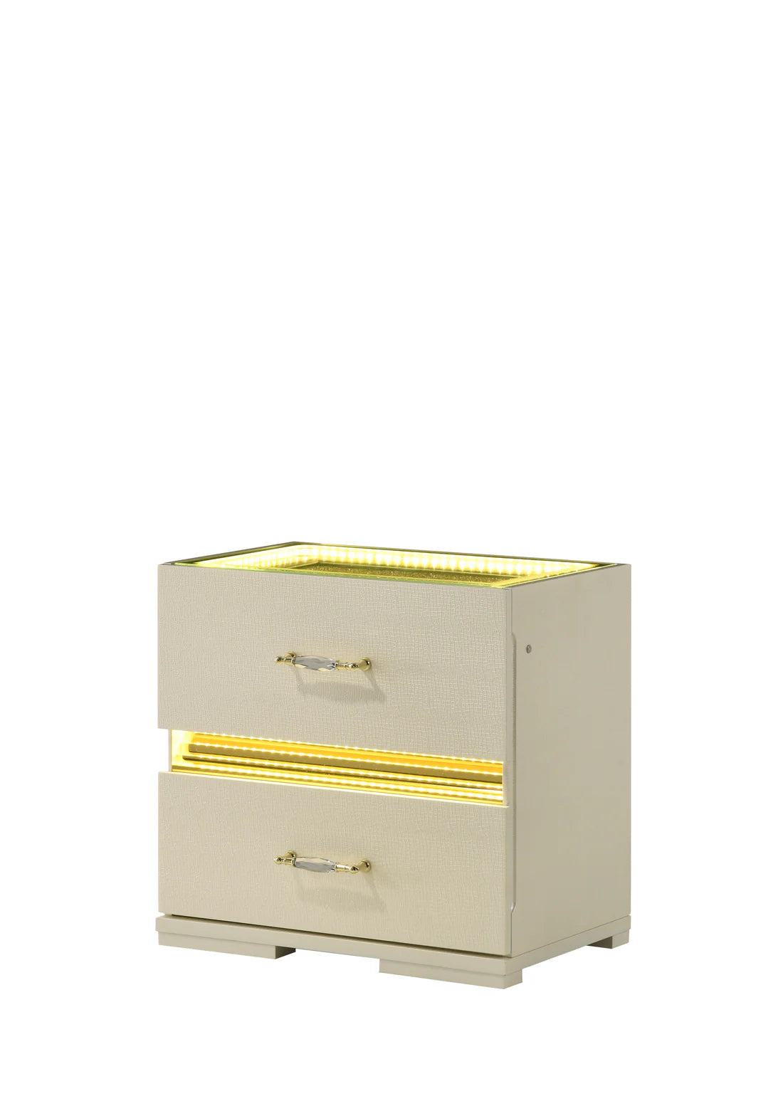 • 2-Drawer Nightstand: The perfect bedside companion with a "glittering" glass top and ambient lighting.