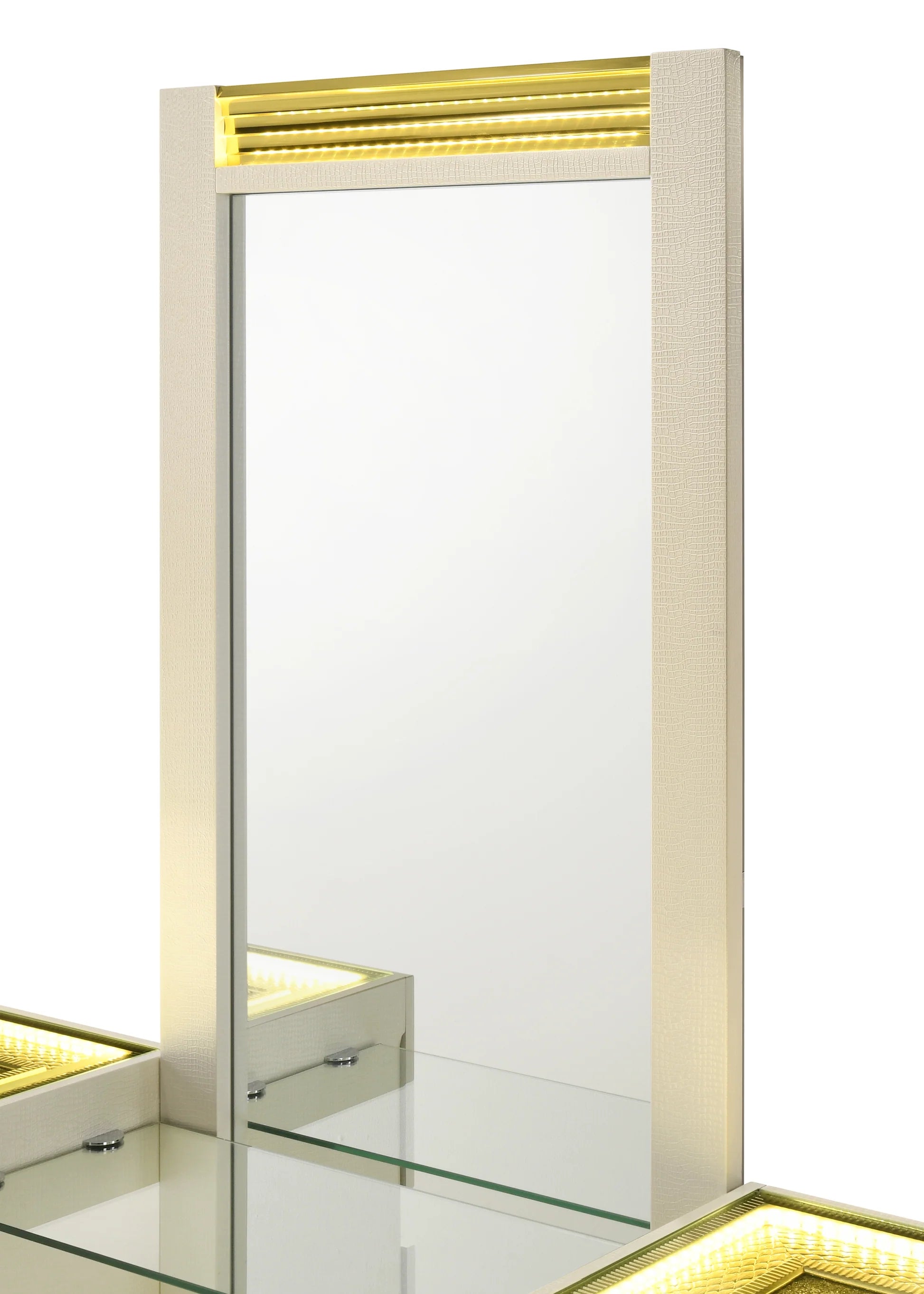Brillia Vanity Set transforms your beauty routine into a luxurious experience. Integrated LED lighting casts a flattering, warm glow across every surface, replacing the need for unflattering overhead fixtures. The ivory faux-crocodile finish delivers sophisticated tactile appeal with its dimensional texture, while crystal-studded hardware and gold-tone accents evoke timeless Hollywood glamour. Engineered with precision-crafted details—from the channel-tufted design to buttery-smooth drawers—this vanity combines enduring quality with undeniable elegance. Elevate your space with a piece that's as functional as it is stunning.