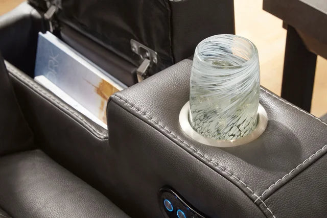 Description: The Lewin Reclining set includes one-touch power control with adjustable positions, an Easy View™ adjustable headrest and zero-draw USB port. Zero-draw technology only consumes power when the USB receptacle is in use. The set has a corner-blocked frame with metal reinforced seat, attached high-quality foam cushions wrapped in poly fiber, and faux leather upholstery. The ambient blue LED lighting on base for a theater-style experience is sure to make any day fun. The armrests have flip-top storage and cup holders, with extra storage in the console. For the music lovers, there is a built-in audio sound system with wireless connectivity with audio controls located on console. A power cord included; UL Listed.