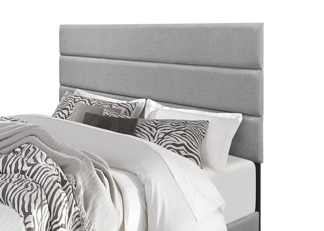 Designed for comfort and style, this platform bed is upholstered in soft gray fabric and finished with a charming line-tufted headboard. Its neutral tone complements any décor, making it a perfect addition to your space.