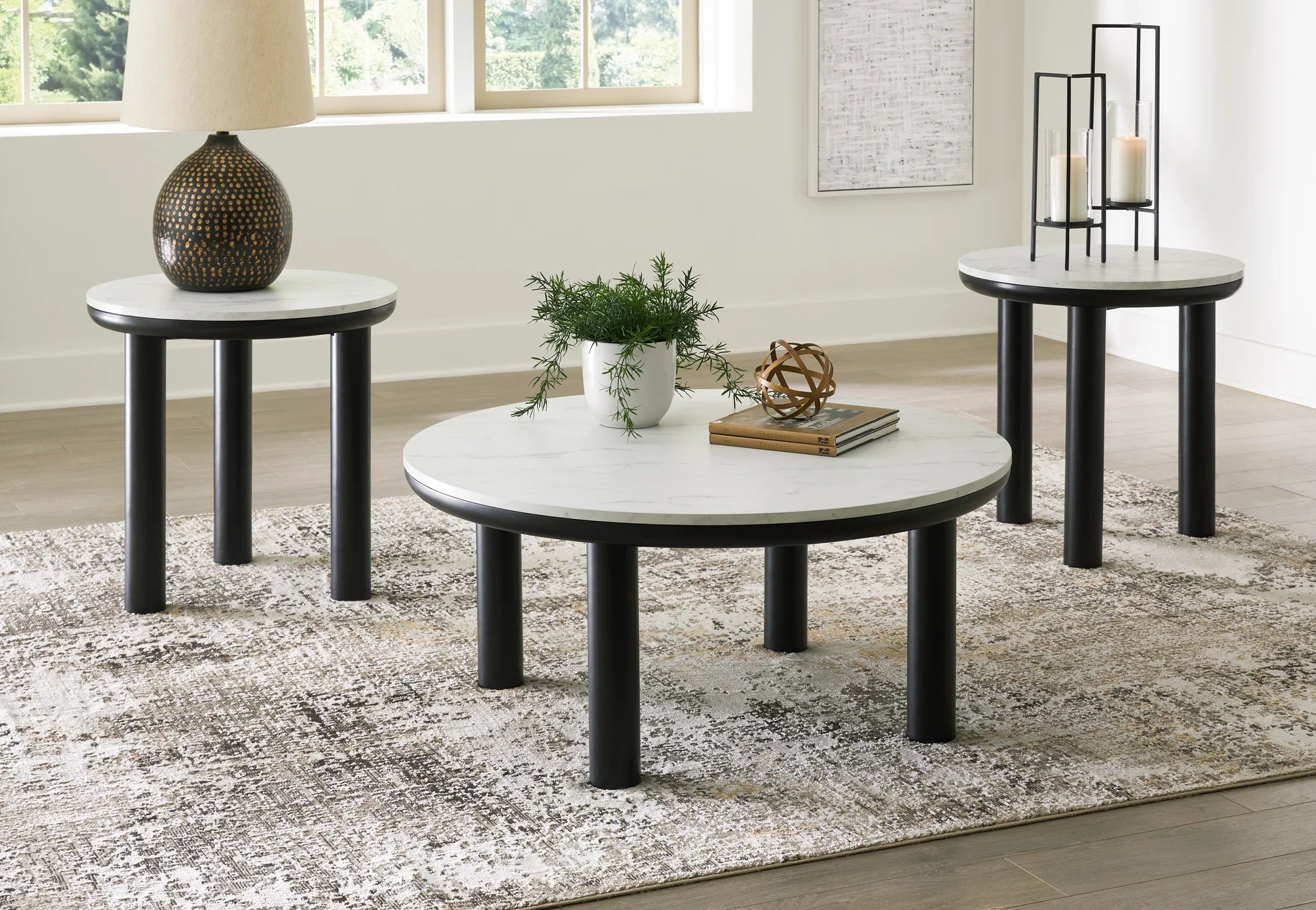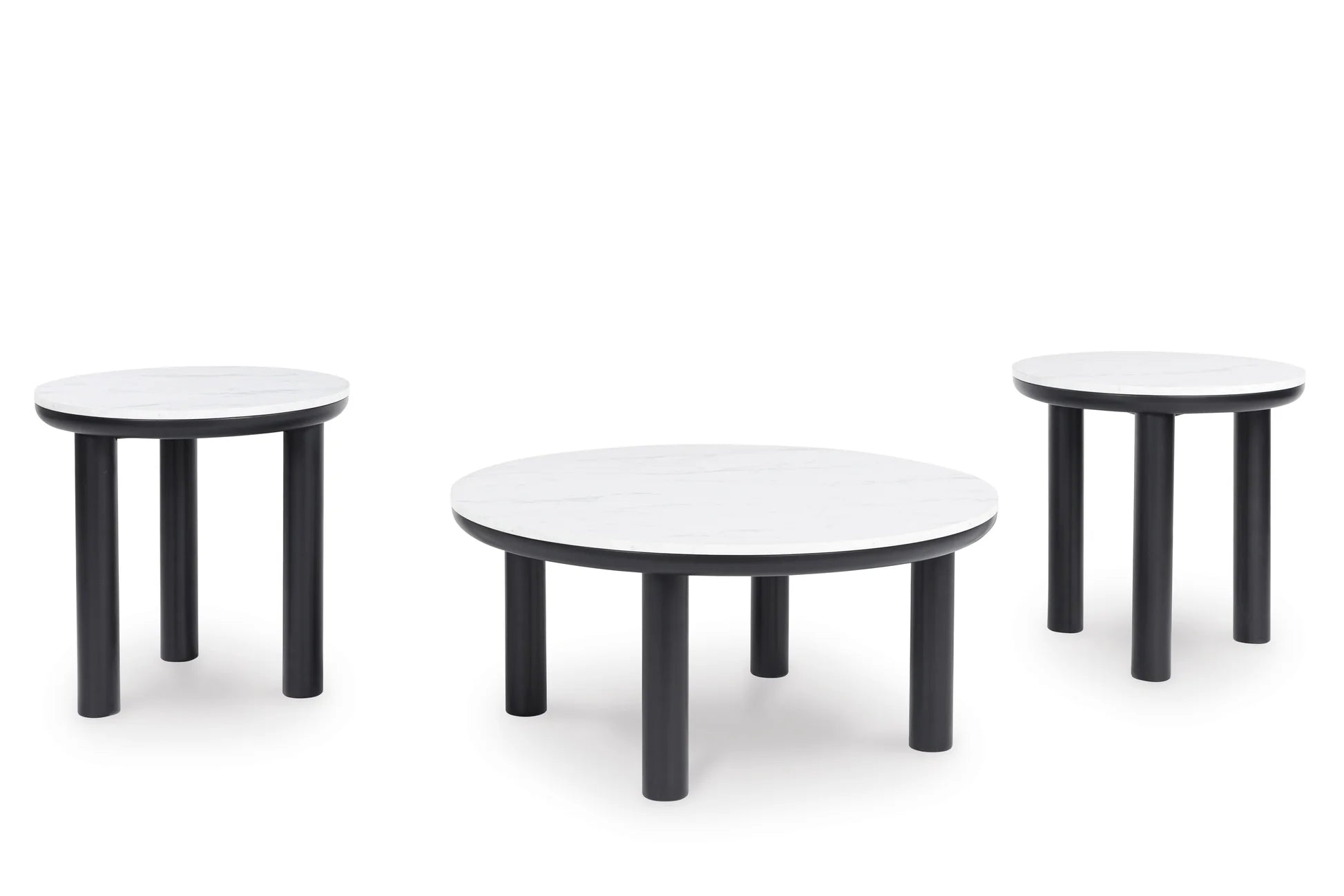 Clean lines meet cool curves with this accent table set. Simple dowel legs and a black finish lend a modern vibe, while replicated white marble tops complete the casual lifestyle design. With their varying heights, these versatile tables can be used together or individually for functionality and style.